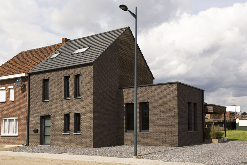 De woning werd opgebouwd uit bio-ecologische materialen. Er werd op de eerste plaats geïnvesteerd in een goed geïsoleerde gebouwschil in houtskelet die op termijn aangevuld kan worden met energiezuinige technieken. Deze snelle bouwmethode in houtskelet, leende zich toe dat de bouwheer ook maximaal de handen uit de mouwen kon steken. De bouwheer koos voor een grijze baksteen in combinatie met hout-aluminium ramen en een gevelbekleding in thermisch verduurzaamd hout.